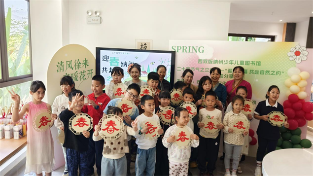 此次活动将节气文化、阅读分享与版纳地域特色深度融合,更以北方极寒与雨林暖春的鲜明温差为独特背景,以“跨越山海的相聚”为核心,让来自全国各地的旅居亲子家庭在南北气候的碰撞与异乡情谊的交融中,真切感受到家的温暖。孩子们在玩中学到传统知识、提升动手能力,更结识了来自天南海北的小伙伴,这场特殊的亲子阅读活动,不仅成为大家西双版纳之旅中难忘的温暖回忆,更让不同地域的文化在交流中绽放光彩。活动最后,所有家庭举起亲手制作的春字合影,齐声喊出活动主题,欢声笑语回荡在雨林华庭分馆的每个角落。