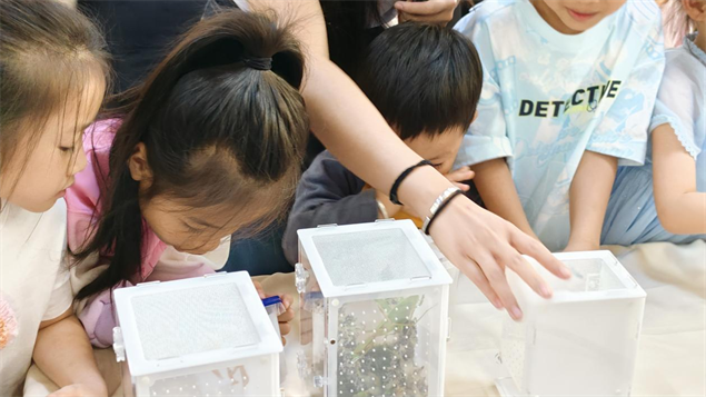 最精彩的环节是《小螳螂大发现》科普课。张斐老师带来了可爱的螳螂,孩子们围坐一圈,近距离观察这些神奇的小生灵。老师用浅显的语言介绍螳螂的外形与种类,告诉大家螳螂和蝴蝶、蚂蚁同属昆虫大家庭。有些小朋友起初有些胆怯,在老师鼓励下,大家勇敢地轻轻触摸,真切感受大自然的奇妙。