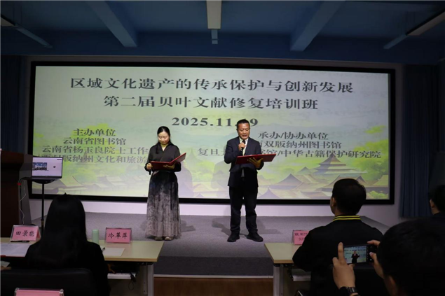 2025年11月19日至24日,为期8天的“区域文化遗产的传承保护与创新发展——第二届贝叶文献修复培训班”在西双版纳州图书馆圆满落幕。此次活动以“一班、一馆、一室”三位一体的创新形式开篇,以“人才培育、技术规范、跨境协作”多元成果收官,不仅标志着西双版纳贝叶文献保护迈入标准化、系统化、常态化新阶段,更构建起澜沧江—湄公河流域文化遗产跨境保护与文明互鉴的坚实桥梁,为国家“一带一路”倡议及面向南亚东南亚辐射中心建设注入深厚文化动能。