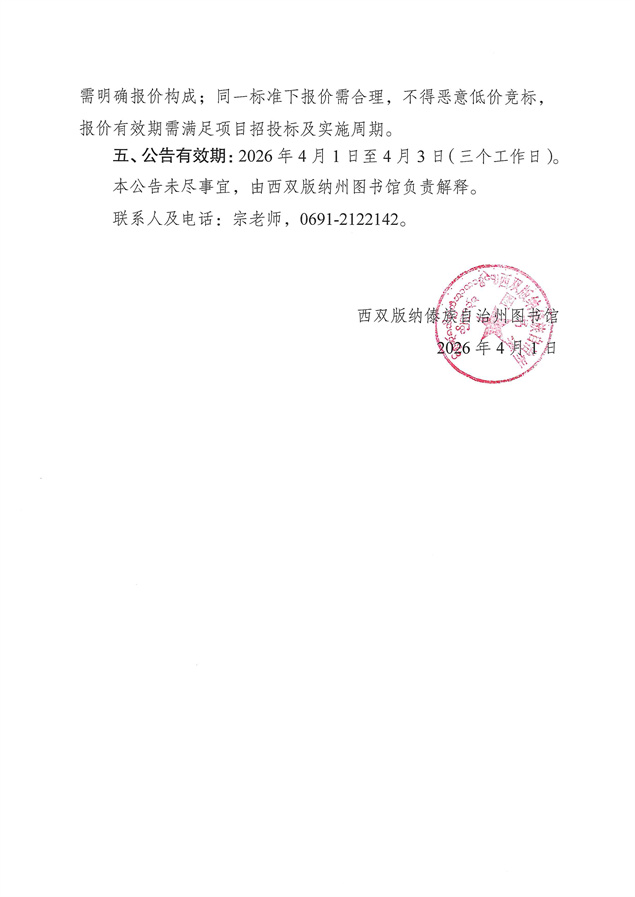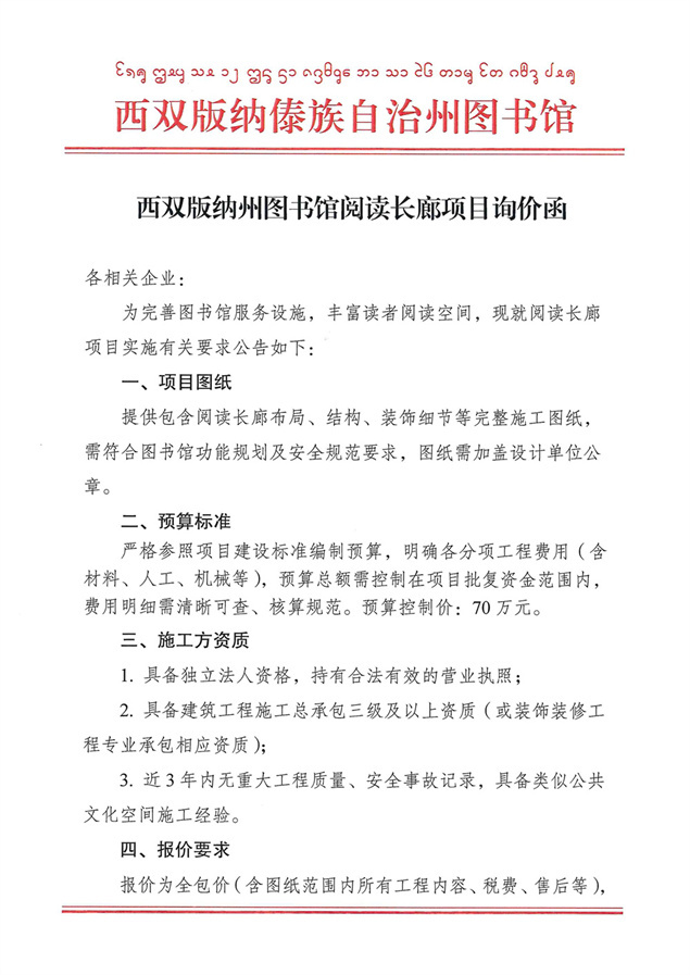 西双版纳州图书馆阅读长廊项目询价函